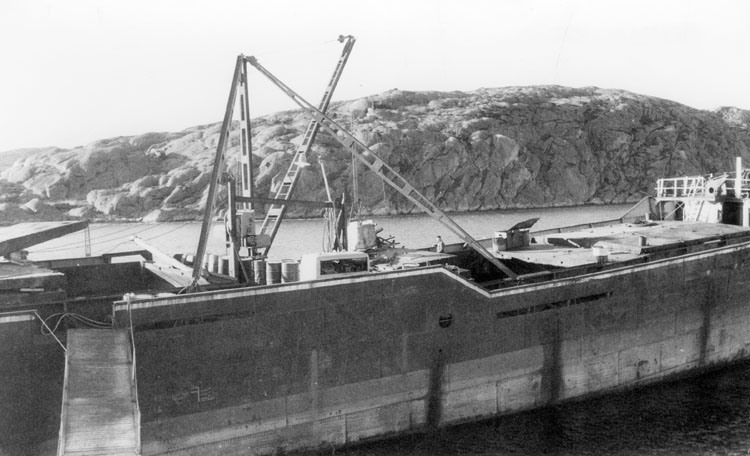 Enligt fotografens notering: "Lysekil. Flytande stenkross i Tullboda 19? före detta Thordénbåt. Se boken om Thordén som sjömansklubben i UA gav ut 1992".