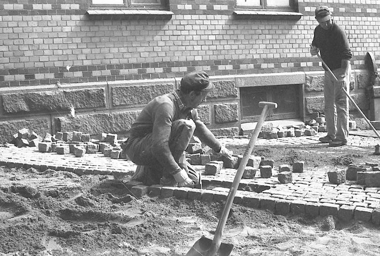Enligt fotografens notering: "Arbete med sättning av smågatsten Lysekil".