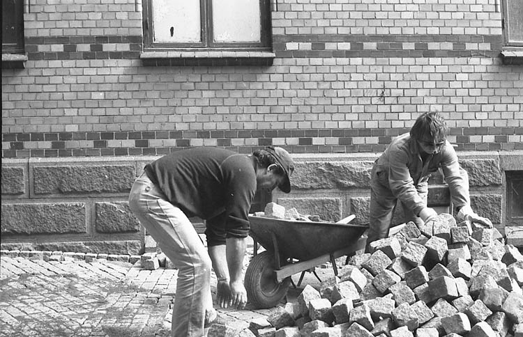 Enligt fotografens notering: "Arbete med sättning av smågatsten Lysekil".