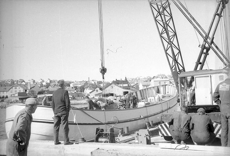 Enligt fotografens notering: "Träfiskebåt från Hälleviksstrand ligger i Lysekil och får maskin, lyfts in med kran, maskinen är en skandia".