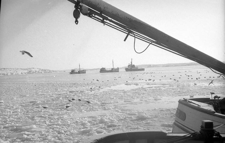 Enligt fotografens notering: "Smögen, Isvinter. Fiskebåtar får bogserhjälp ut i sjön".