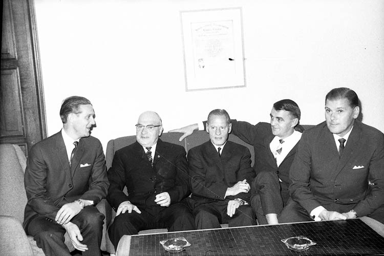 Enligt fotografens notering: "Litograf. jub. Lysekil 1966. Fr. vänster: Stig Andersson, Sten Carlsson, Nils Nydén, Erling Johansson och Erik Johansson".