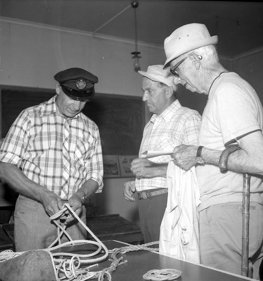 Enligt fotografens notering: "Sjömannen Sigurd Andersson t.v. Skaftö visar sjömansarbete".