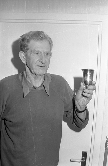 Enligt fotografens notering: "Gösta Klasson Kungshamn fiskare visar pokal".
