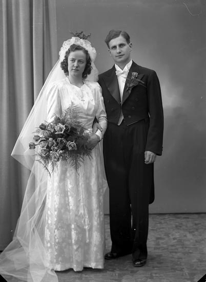 Enligt fotografens journal nr 7 1944-1950: "Happ, Brudpar Olsson, Jarlsg. 12 Uddevalla".