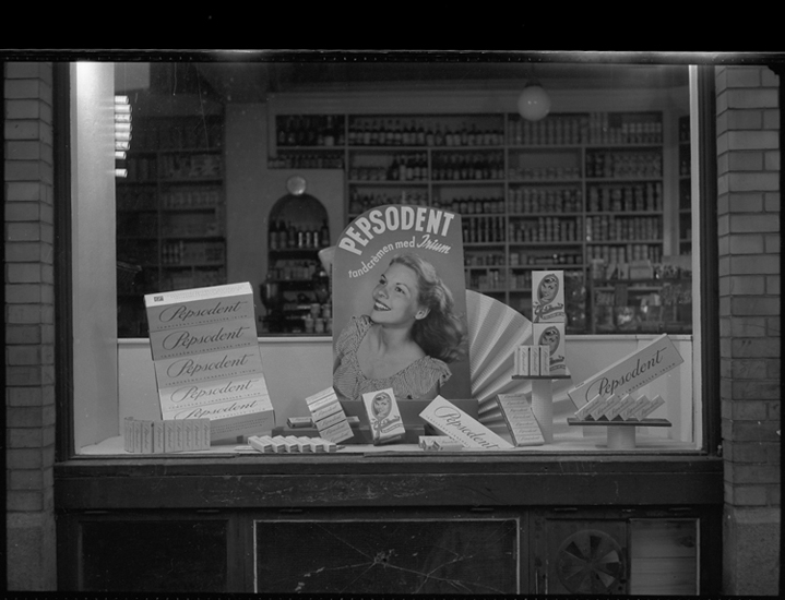 Text till bilden: "Skyltfönster. Handelskompaniet. Vestkusten. Pepsodent. 1950"