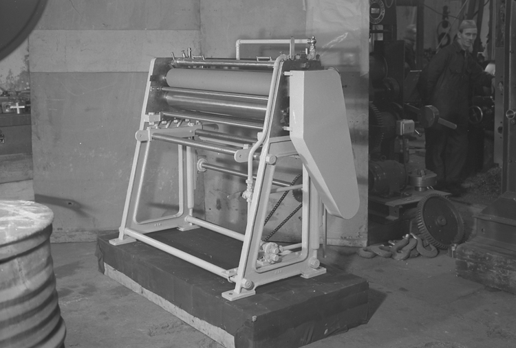 Text till bilden: "Bro Mek. Verkstad. Lackeringsmaskin. 1949.12"