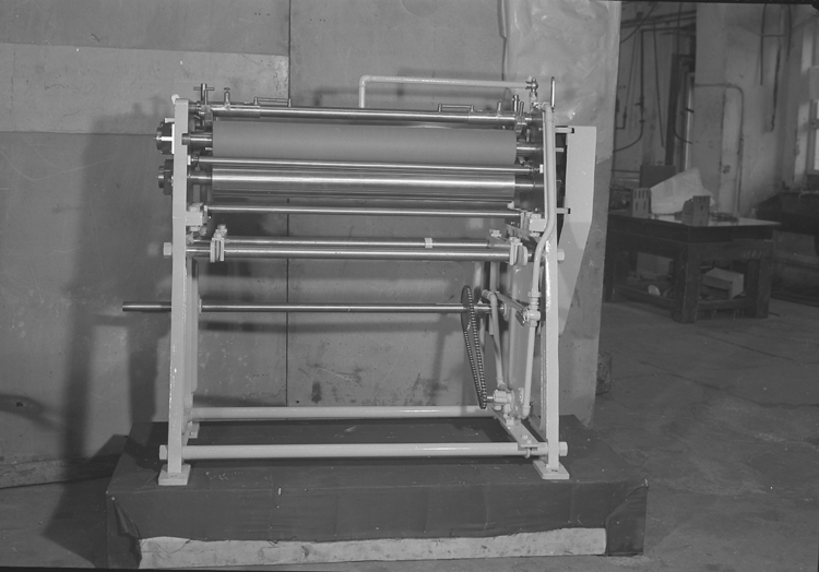 Text till bilden: "Bro Mek. Verkstad. Lackeringsmaskin. 1949.12"