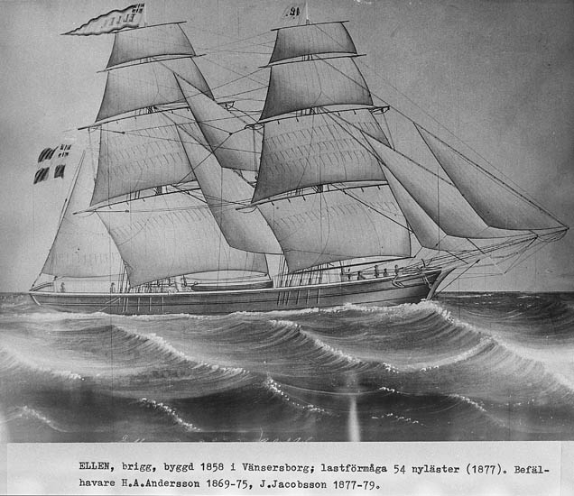 Text som medföljer kortet: "Ellen" brigg, byggd 1858 i Vänersborg, lastförmåga 54 nyläster (1877). Befälhavare H. A. Andersson 1869-75, J. Jacobsson 1877-79".