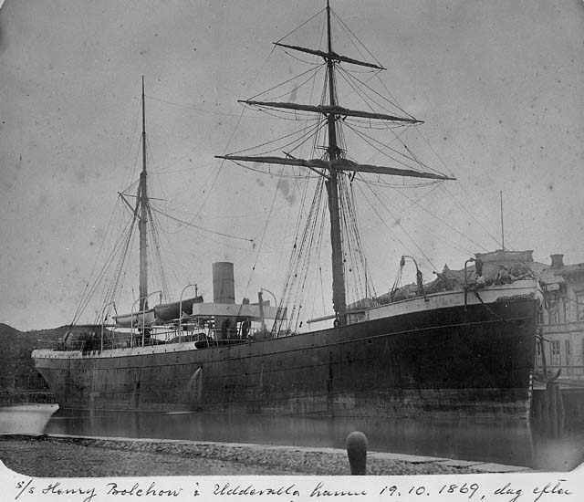 Text på kortet: "s/s Henry Belchow" i Uddevalla hamn 19.10.1869, dag efter det hamnbyggnaden synats".