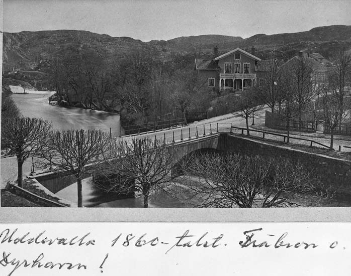 Text på kortet: "Uddevalla 1860-talet. Träbron o. Dyrhaven!".