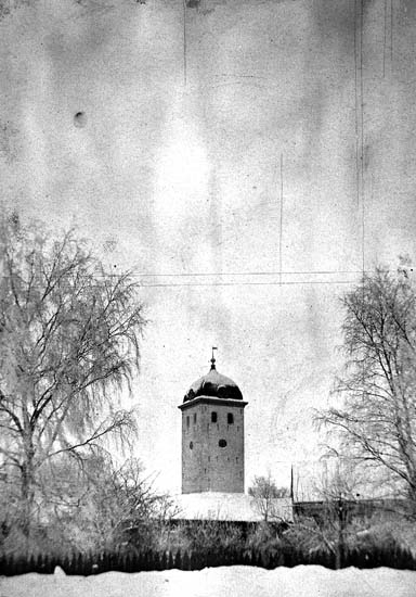 Enligt text på fotot: "Klocktornet från Margretegärde södra sida. Staketet hör till norra sidan om Thernströms trädgård".