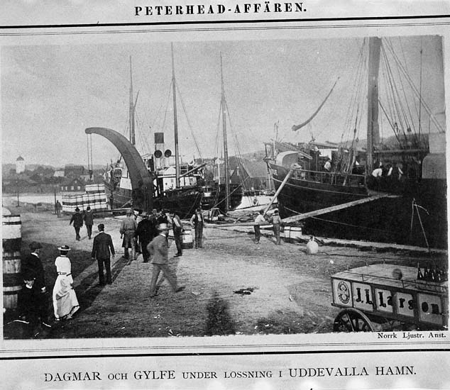 Text på kortet: "Peterhed-affären. Dagmar och Gylfe under lossning i Uddevalla hamn".