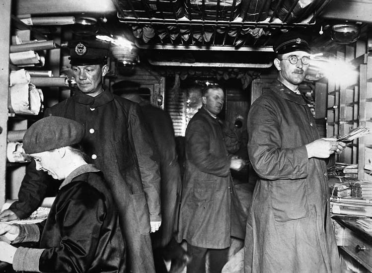 Enl. tidigare noteringar: "Interiör från postkupé i järnvägsvagn på banan Uddevalla - Herrljunga. Personen Maja Törner, kapten Engborg m.fl".
