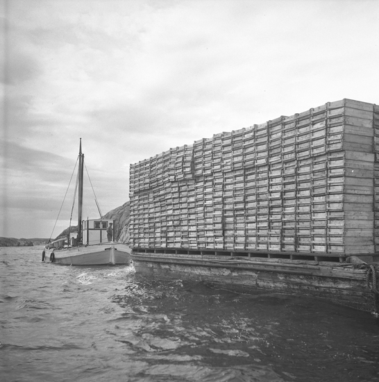 Fisklådor staplade på en pråm bogserad av en jakt