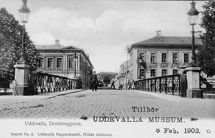 Tryckt text på vykortets framsida: "Uddevalla Drottninggatan".