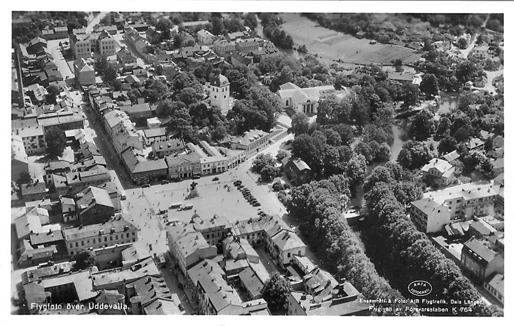 Tryckt text på vykortets framsida: "Uddevalla från flygplan".