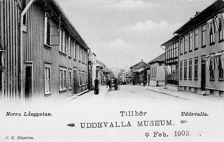 Tryckt text på vykortets framsida: "Norra Långgatan Uddevalla".