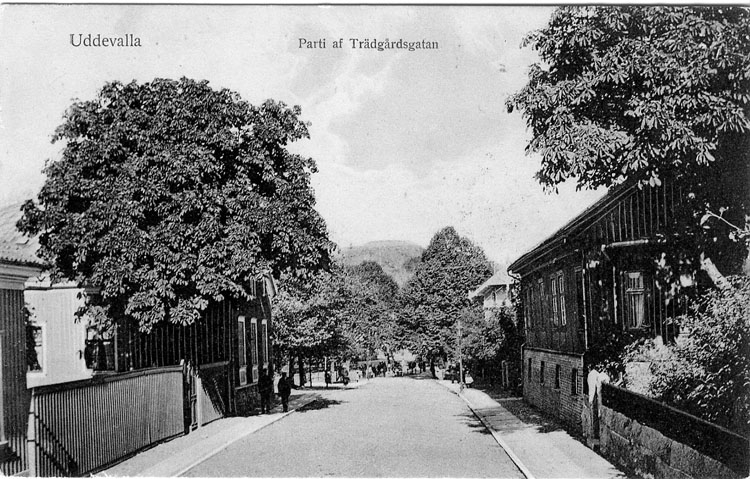 Tryckt text på vykortets framsida: "Uddevalla parti af Trägårdsgatan".