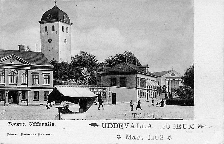 Tryckt text på vykortets framsida: "Torget, Uddevalla".