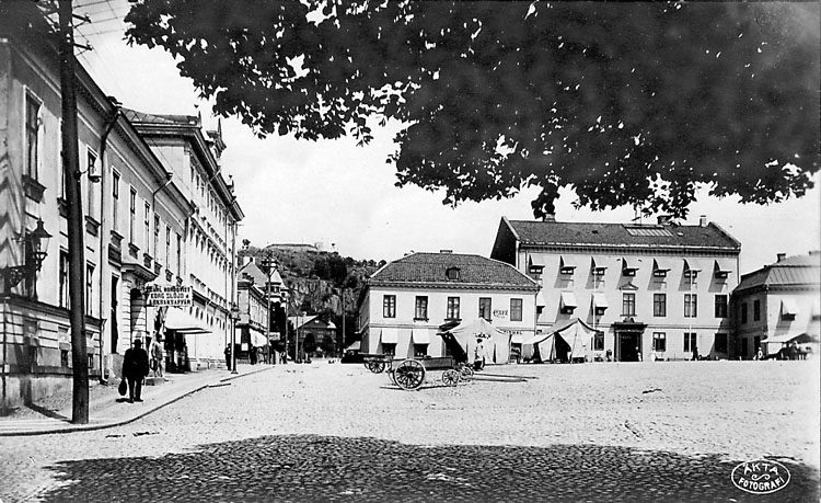 Tryckt text på vykortets framsida: "Uddevalla Parti av Kungstorget"