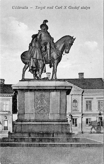 Tryckt text på vykortets framsida: "Torget med Carl X Gustafs statyn Uddevalla".