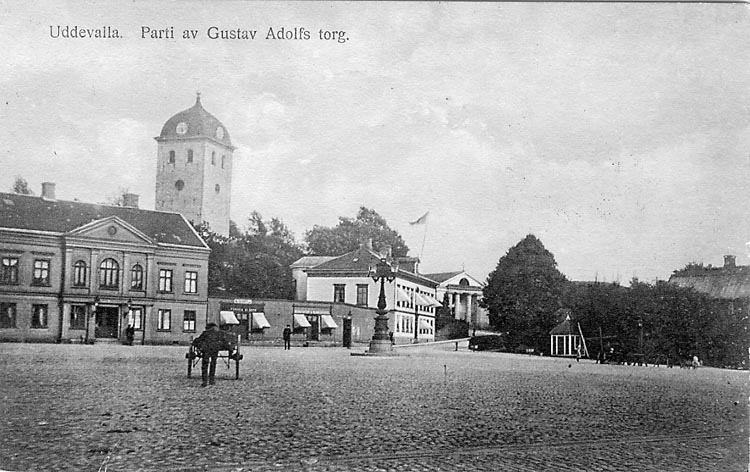 Tryckt text på vykortets framsida: "Uddevalla Parti av Gustav Adolfs torg".