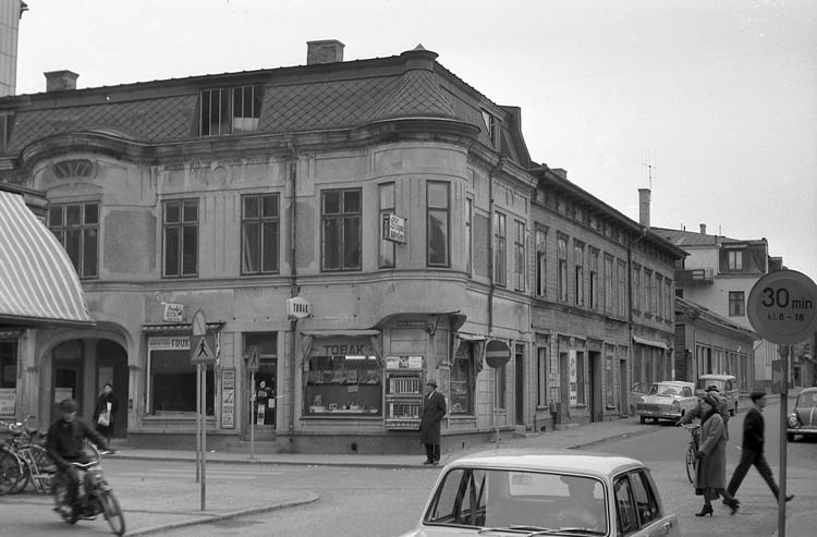 Text till bilden:"N.a Drottningsgatan-Kilbäcksgatan. Rivet 1963-64. Här ligger Sparbanken nu 1997. G. Ljungs Tobak".