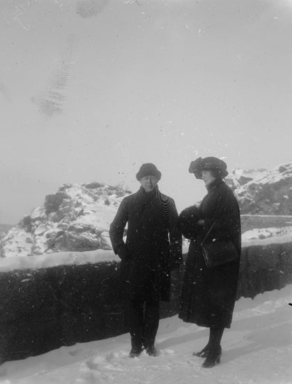 Enl. text i blå bok: "Man och kvinna i vinterkläder. Stenmur."
