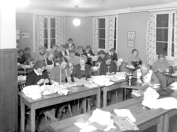 Text till bilden:"I en liten lokal sitter damer som syr för hand och på maskin".