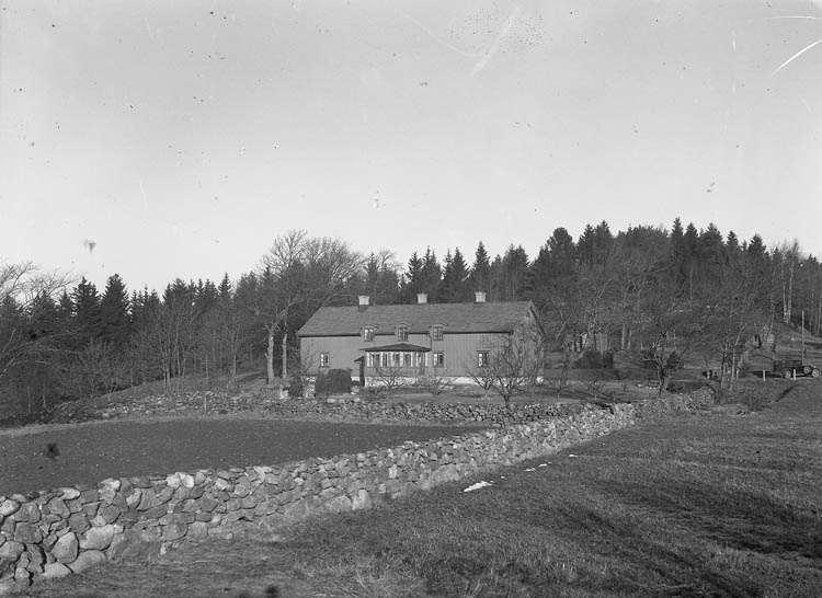 Text till bilden:"Skafteröds gård. Stort boningshus. Gärdsgård, åkermark, en bil och skog i bakgrunden".