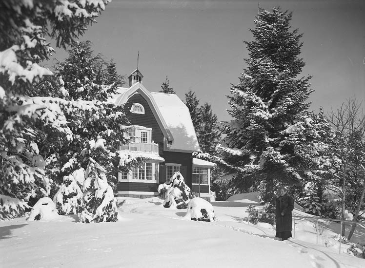 Text till bilden:"Snötyngda granar och ett litet hus inne bland dem. Fru Kullgren står i snön intill en gran".