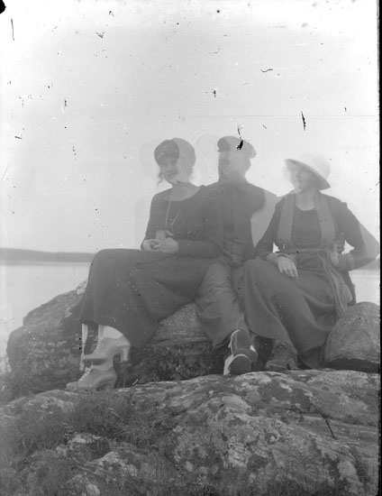 Enl. text i blå bok: "Två damer och en man sittande på ett berg."