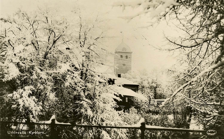 Tryckt text på bilden: "Uddevalla kyrktorn."
