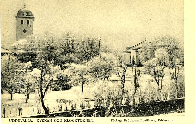 Tryckt text på bilden: "Uddevalla. Kyrkan och klocktornet."