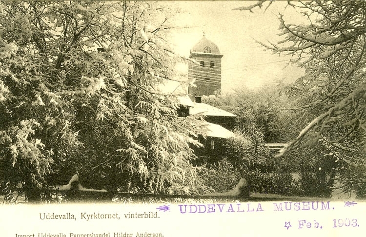 Tryckt text på bilden: "Klocktornet, Vinterbild, Uddevalla."
