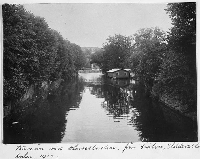 Text på kortet: "Bäveån vid Hasselbacken, från träbron, Uddevalla omkr. 1920".
