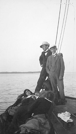 Ett sällskap på en båt, några ligger på däck, två män står upp, den ena med armen om den andra