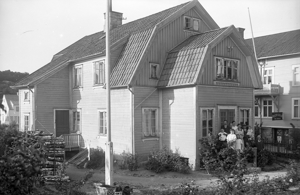 Text till bilden: "Hus med persongrupp, Karlsberg, Uddevalla. Den 23/7 1922".