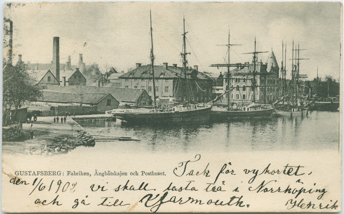 Notering på kortet: Gustafsberg. Fabriken. Ångbåtskajen och Posthuset.