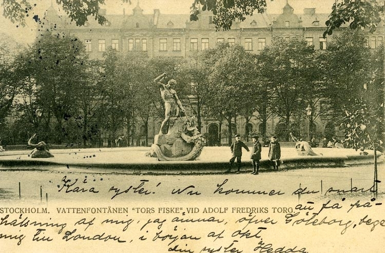 Notering på kortet: Stockholm. Vattenfontän "Tors fiske" vid Adolf Fredriks torg.