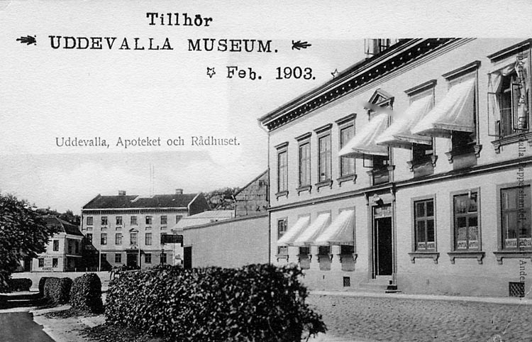 Tryckt text på vykortets framsida: "Uddevalla Apotek och Rådhuset."