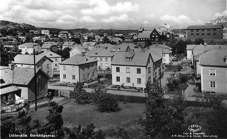 Tryckt text på vykortets framsida: "Uddevalla. Barkhögarna."