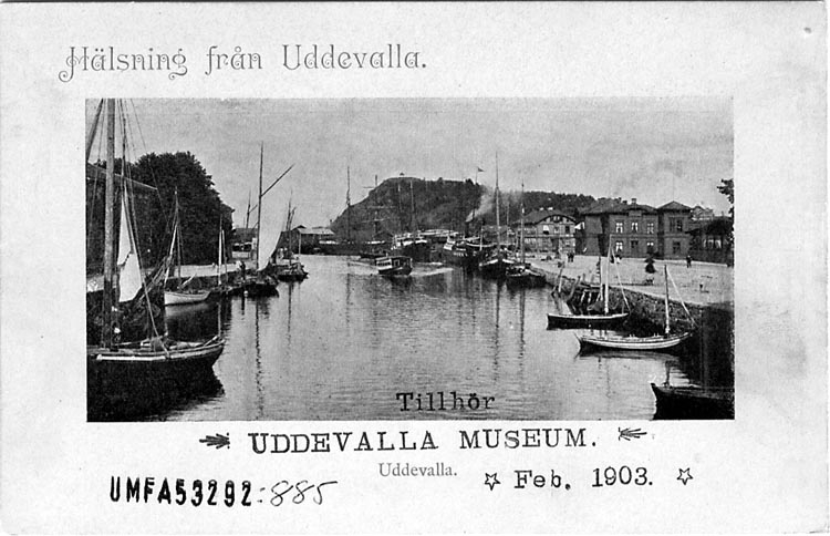 Tryckt text på vykortets framsida: "Hälsning från Uddevalla."