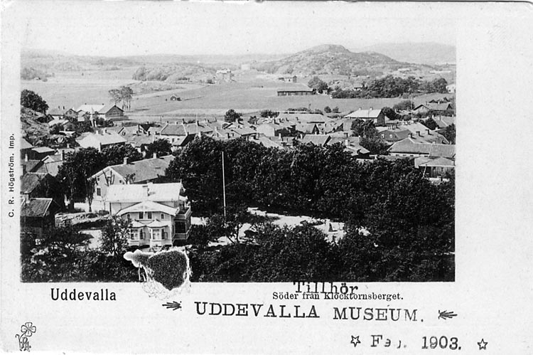 Tryckt text på vykortets framsida: "Söder från Kyrktornsberget."