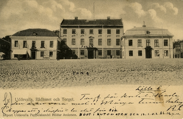 Tryckt text på vykortets framsida: "Uddevalla Rådhuset och torget."