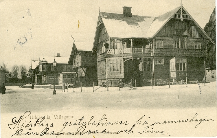 Tryckt text på vykortets framsida: "Uddevalla, Villagatan."
