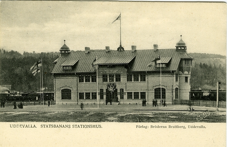 Tryckt text på vykortets framsida: "Uddevalla, Statsbanans Stationshus."