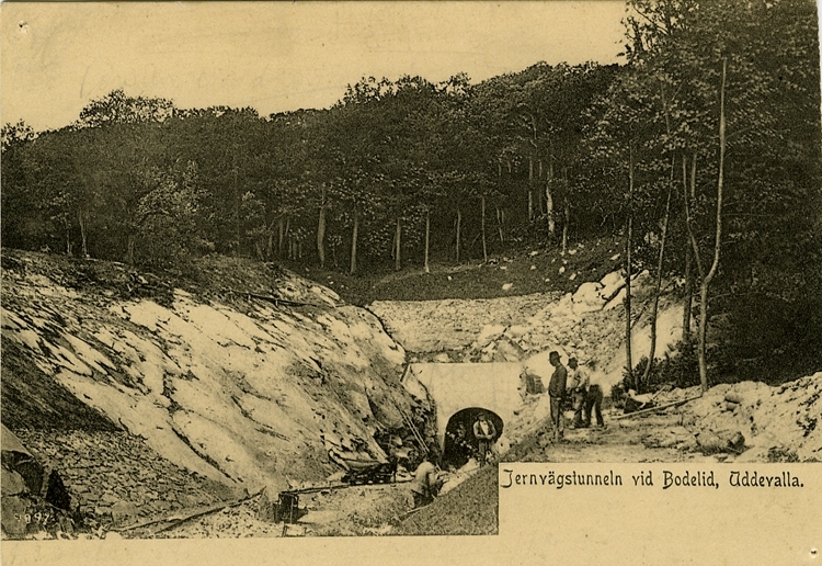 Tryckt text på vykortets Framsida: "Järnvägstunneln vid Bodelid, Uddevalla."