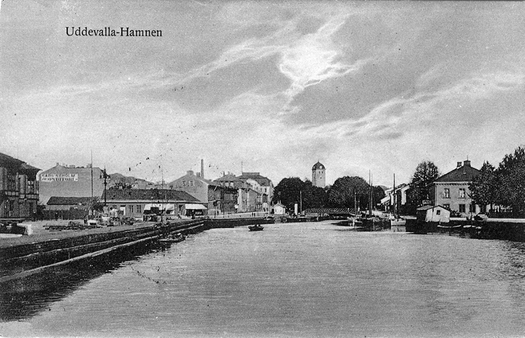 Tryckt text på vykortets framsida: "Uddevalla - Hamnen."